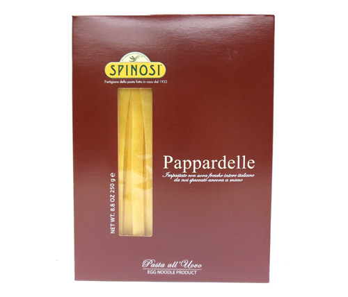 Wide ribbons of delicate egg noodles are made by Spinosi of whole fresh eggs and durum wheat semolina. The pasta shape is wide but delicate and light. Pappardelle is the classic accompaniment to beef or game-based sauces, such as rabbit, or sausages with red and yellow peppers. This pasta cooks in 1 to 2 minutes.